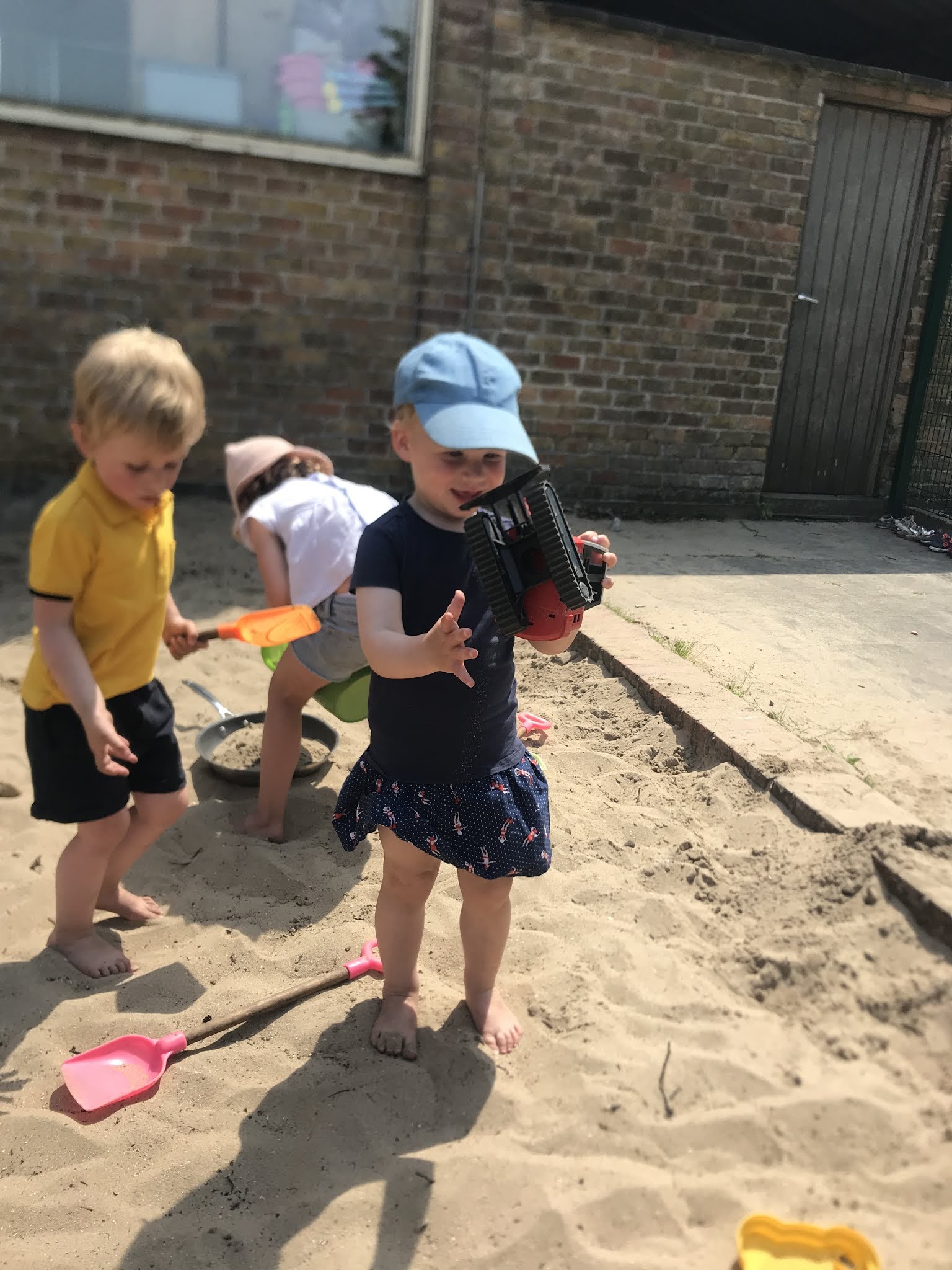 Met het mooie lente-weer hebben we veel in de tuin gespeeld. De kleuters mochten in de zandbak lijnen tekenen en bollen proberen te maken.